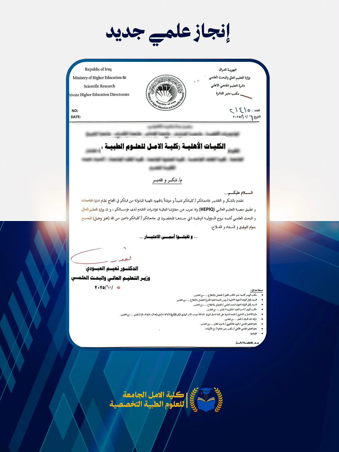 Dr. Mufid Jalil pointed out that Al-Amal College seeks to prepare specialized medical cadres that contribute effectively to serving the health sector in Iraq, with a focus on providing modern study programs that are in line with the requirements of the labor market. It is pointing out that the college is distinguished by its modern infrastructure and advanced laboratories that meet international standards.